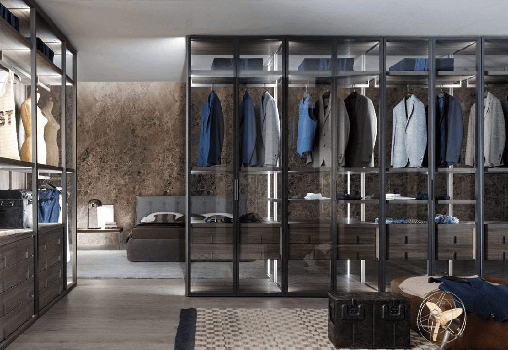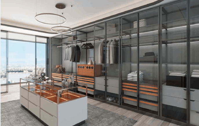 Encased in smoked or tinted glass with anodized aluminum framing, this walk-in wardrobe transforms dressing into an immersive experience. Integrated LED lighting accentuates textures and silhouettes, creating a boutique-inspired ambiance, while floating shelving, concealed drawers, and modular hanging systems ensure effortless organization.